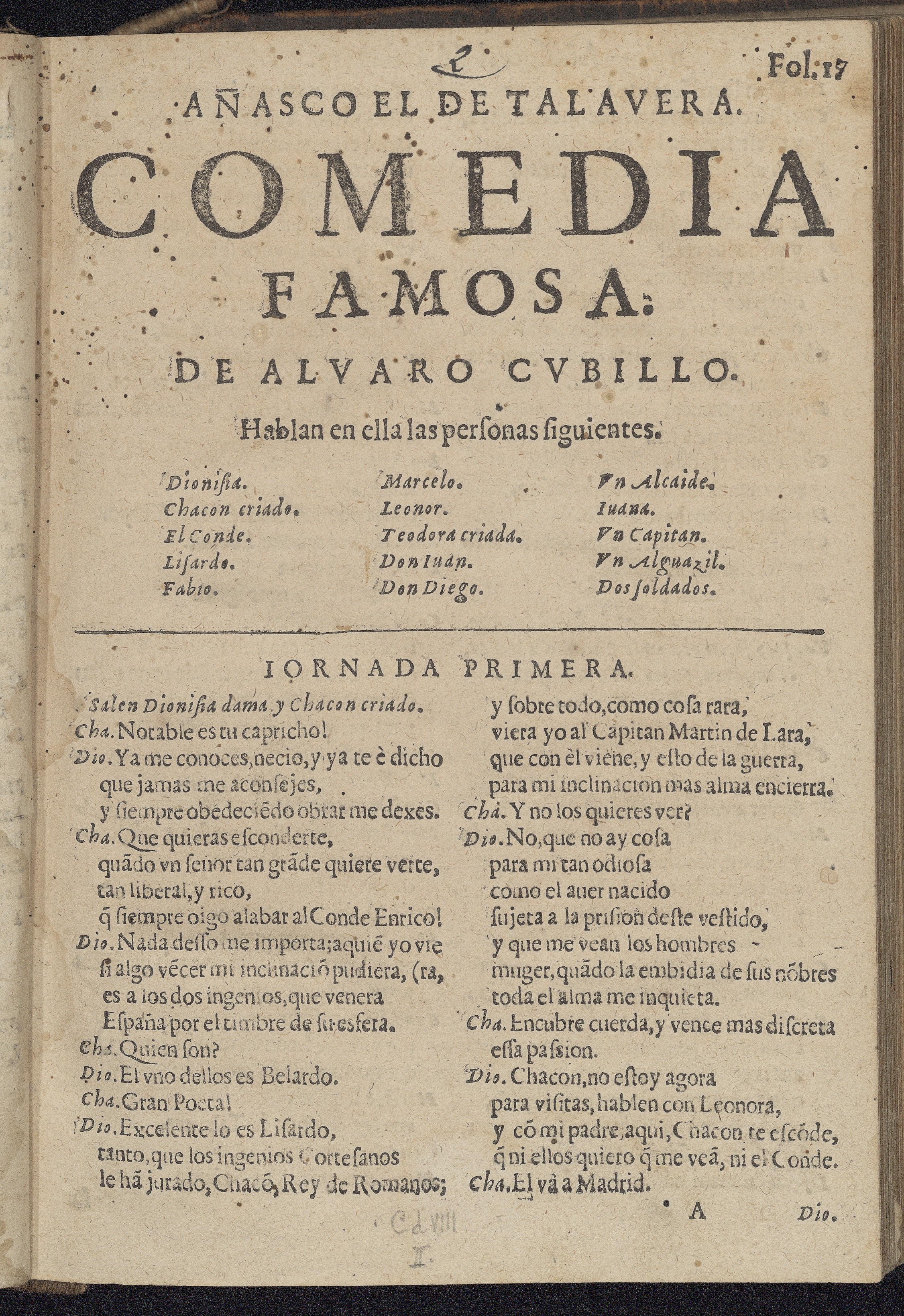 Fol. I. / AÑASCO EL DE TALAVERA. / COMEDIA / FAMOSA. / DE ALVARO CVBILLO. / Hablan en ella las perſonas ſiguientes. / [dram. pers. a 3 col.] / [filete] / IORNADA PRIMERA. / Salen Dioniſia dama y Chacon criado. / Cha. Notable es tu capricho! / Dio. Ya me conoces, necio, y ya te è dicho / que jamás me aconſejes,