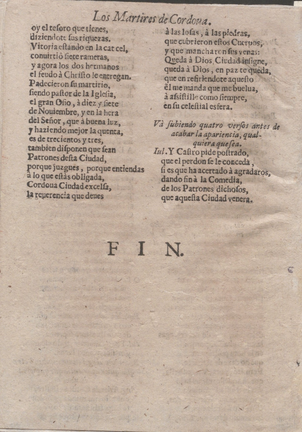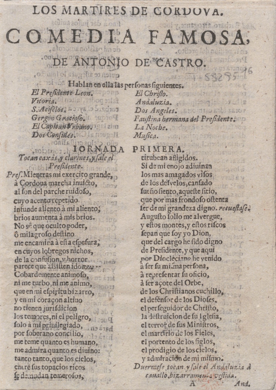 LOS MARTYRES DE CORDOVA. / COMEDIA / FAMOSA, / DE DON ANTONIO DE CASTRO. / Hablan en ella las perʃonas ʃiguientes. / [dram. pers. a dos cols.] / [filete] / JORNADA PRIMERA. / Tocan caxas, y clarines, y ʃale el / Preʃidente./ Preʃi. Mientras mi exercito grande, / a Cordova marcha invicto, / al ʃon del parche ruydoʃo,